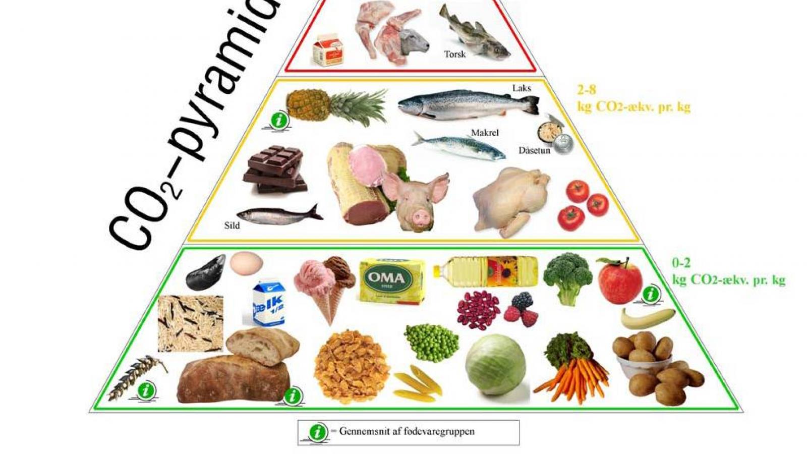 Læg en masse madvarer i kasser og bed spejderne placere dem på de tre hylder i pyramiden. De madvarer, der udleder mest CO2 skal i toppen, dem der udleder mindst skal i bunden og resten skal i midten.