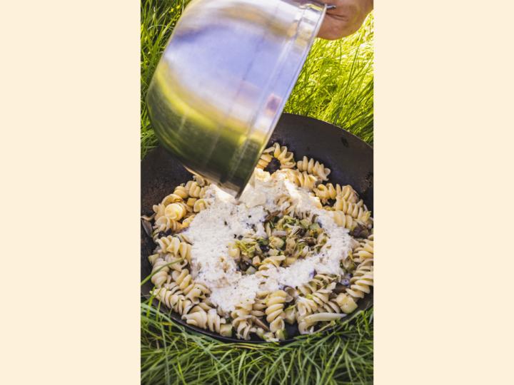 Grøntsagspasta à la carbonara Aftensmadsopskrift fra kogebogen Ild, mad og fællesskab. Opskriften er lavet til 10 personer og egnet til sommermånederne. Familiespejder Mikro Mini Junior Trop Senior 120+ minutter
