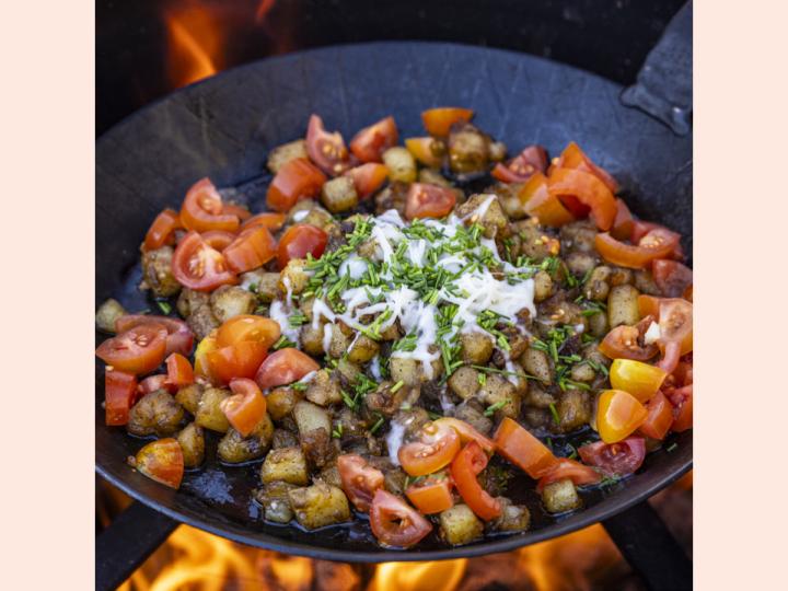 Råstegte kartofler med tomat og purløg Morgenmadsopskrift fra kogebogen Ild, mad og fællesskab. Opskriften er lavet til 10 personer og egnet til efterårsmånederne. Familiespejder Mikro Mini Junior Trop Senior 90-120 minutter