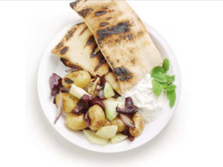 Grillede fladbrød med grøntsager og melon Fladbrød kan være et alternativ til snobrød. Her med en blanding af grøntsager og melon, kryderet med spidskommen og en yoghurtmyntedressing til Mini Junior Trop Senior 120+ minutter