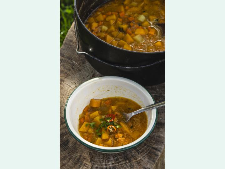 Græskarsuppe Aftensmadsopskrift fra kogebogen Ild, mad og fællesskab. Opskriften er lavet til 10 personer og egnet til vintermånederne. Familiespejder Mikro Mini Junior Trop Senior 60-90 minutter
