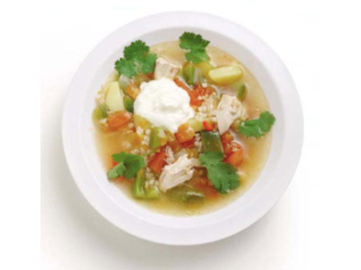 Krydret kyllingesuppe med perlebyg En spændende fyldig kyllingesuppe med perlebyg, abrikoser, frisk korriander og hvidløgsyoghurt. Junior Trop Senior 90-120 minutter