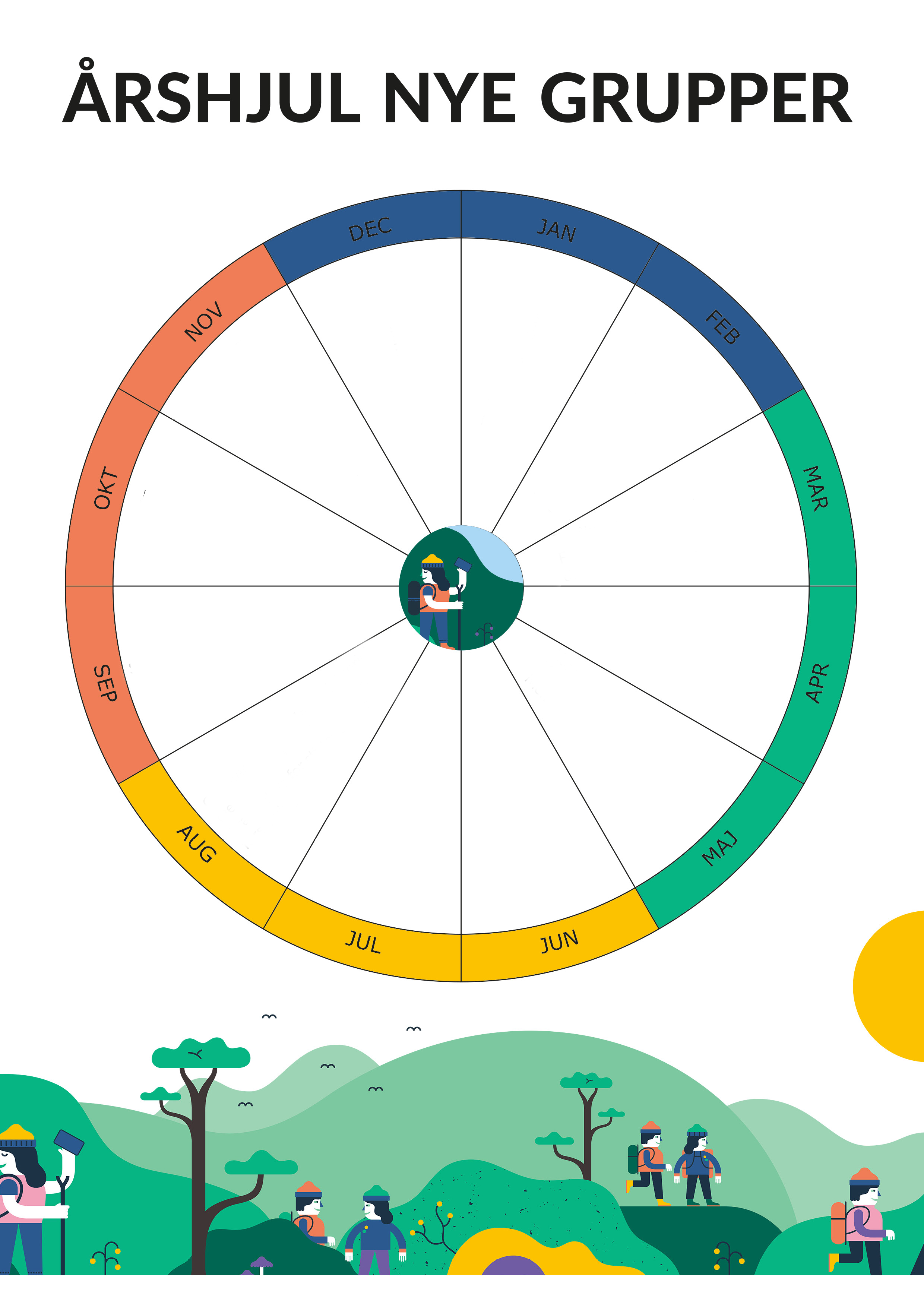 Årshjulet kan bl.a. indeholde bestyrelsesmøder, gruppeture, juleafslutning, grupperådsmøde og alt andet, der er vigtigt for gruppens år. Årshjulet kan hjælpe med at holde overblik over, hvilke opgaver gruppen skal holde styr på, og hvem der har ansvaret for hvilke opgaver. Vi har udfyldt en skabelon med de vigtigste mærkedage.