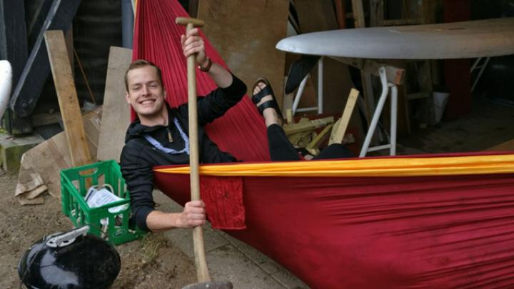 Tømmerflåden sejles ved, at man placerer hængekøjerne parallelt med flydeelementerne, sætter sig i dem og padler afsted med pagajerne.