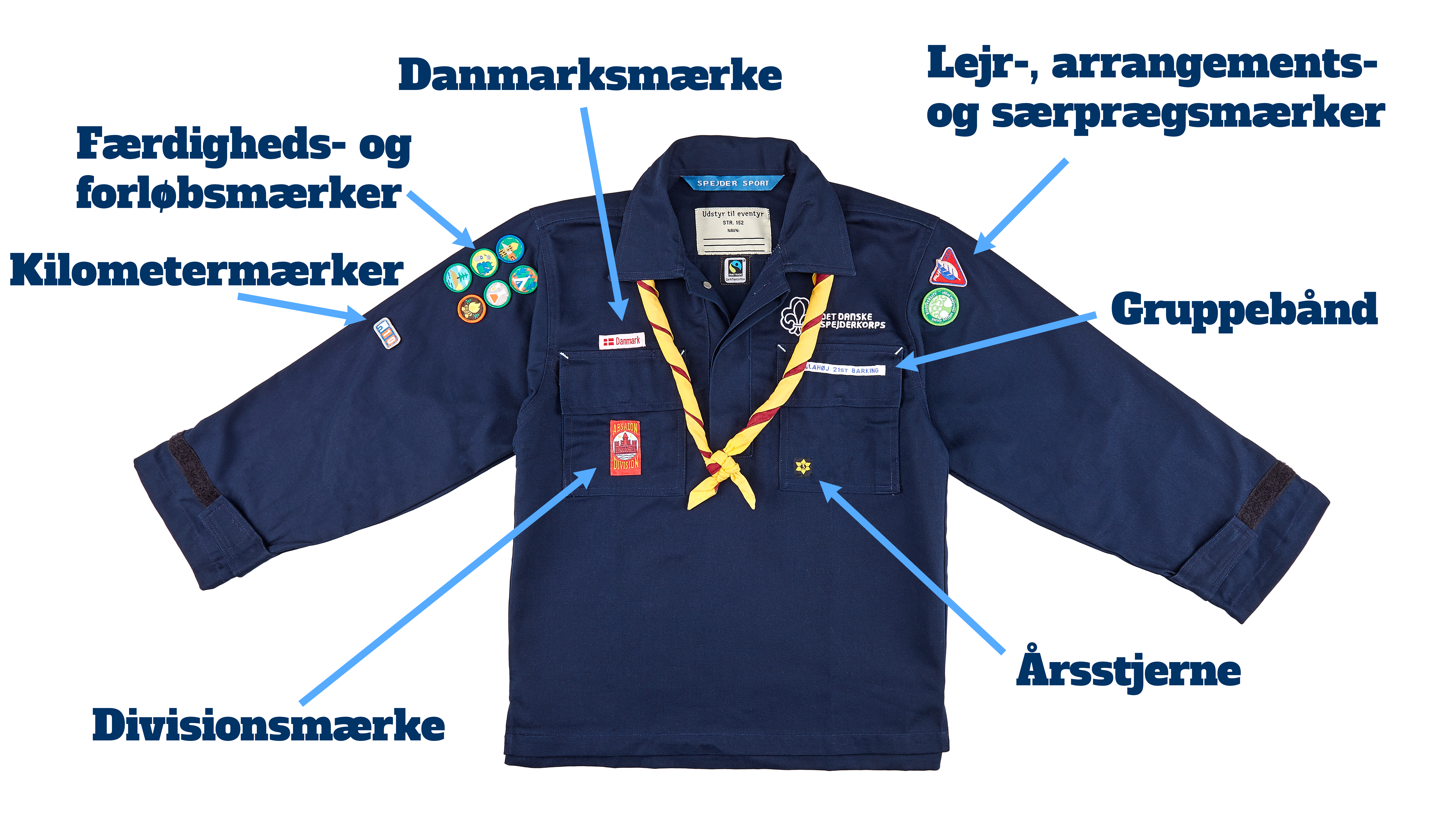 Over venstre lomme sidder korpsmærket. På lommeklappen sidder dit gruppemærke. Din årsstjerne skal du sy på selve lommen.